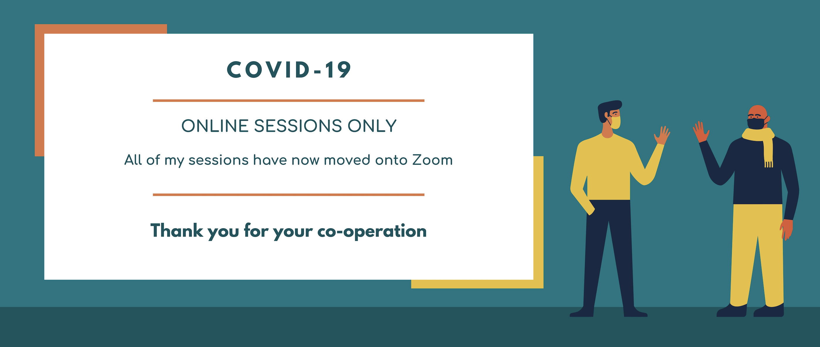 Lastly, I would like to thank you for your co-operation in this difficult time and for your continued support. I look forward to the future, reopening my doors to in-person sessions. For now, I wish you good health for your friends and family.